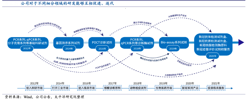 經(jīng)典案例:根據(jù)wind、公司公告、太平洋研究院整理等綜合資訊表明,由于下游應(yīng)用領(lǐng)域非常廣泛,諾唯贊公司可以選擇的研發(fā)方向較多,能夠根據(jù)自身發(fā)展情況、客戶及市場需求進行技術(shù)和產(chǎn)品開發(fā),且對于不同細分領(lǐng)域的研發(fā)能夠互相促進、迭代?;谠陂_展生物試劑業(yè)務(wù)過程中形成的核心技術(shù)及關(guān)鍵原料儲備,其積極向下游應(yīng)用領(lǐng)域進行業(yè)務(wù)拓展,已成功建立了較為豐富的POCT 產(chǎn)品線。