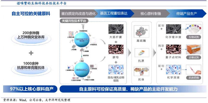 經(jīng)典案例:根據(jù)wind、公司公告、太平洋研究院整理等綜合資訊表明,諾唯贊成立之初即聚焦于該領(lǐng)域, 經(jīng)過近 10 年技術(shù)迭代,建立了圍繞功能性蛋白質(zhì)的關(guān)鍵共性技術(shù)平臺,快速、高效、規(guī)?;亻_發(fā)出 200 余種基因工程重組酶和 1,000 余種高性能抗原和單克隆抗體等關(guān)鍵原料。