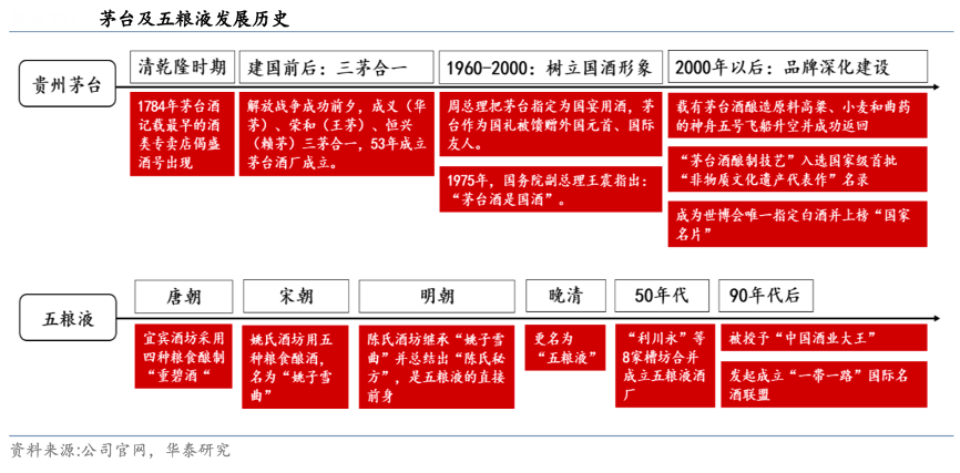 經(jīng)典案例:根據(jù)公司官網(wǎng)、華泰研究等綜合資訊表明,文化在歷史中沉淀且貫穿始終,以茅臺、五糧液兩大龍頭為例,其可考?xì)v史均可追溯至建國前,口碑代代相傳,酒香與歷史相互縈繞,五糧液名字由來的五谷雜糧“陳氏秘方”、國窖 1573 的明朝萬歷年間的“國寶窖池”,茅臺與三渡赤水的紅軍結(jié)下不解之緣等等故事都使得品牌的歷史底蘊(yùn)增厚,建國后在重要的外交及其他政商場所頻頻亮相,核心圈層加持賦予其高端形象,同歷史凝結(jié)成名酒氣質(zhì)。