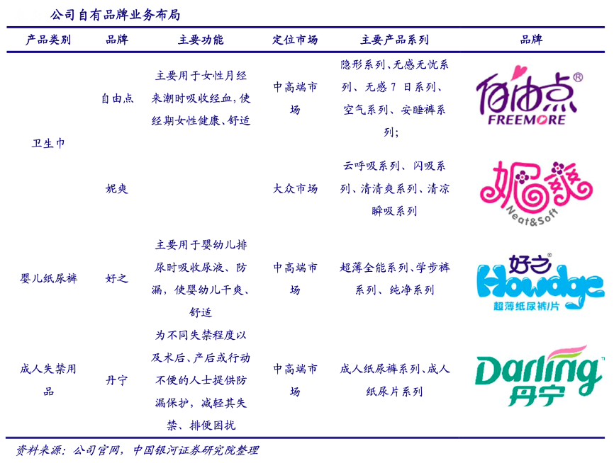 經(jīng)典案例:根據(jù)公司官網(wǎng)、中國銀河證券研究院等綜合資訊表明,百亞股份公司擁有的自有品牌產(chǎn)品包括衛(wèi)生巾、嬰兒紙尿褲、成人失禁用品,涵蓋中高端市場和 大眾市場。“自由點(diǎn)”、“妮爽”衛(wèi)生巾,分別定位于中高端市場和大眾市場,“自由點(diǎn)”品牌理 念為青春自由,包含有多個系列的產(chǎn)品,分別針對女性不同需求的場景,是公司目前的拳頭產(chǎn) 品。“妮爽”產(chǎn)品定位大眾市場,價(jià)格優(yōu)惠,滿足大眾女性的生理期需求。