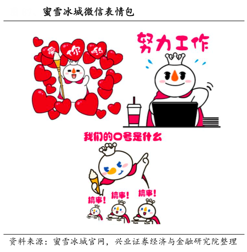 經(jīng)典案例:根據(jù)蜜雪冰城官網(wǎng)、興業(yè)證券經(jīng)濟(jì)與金融研究院等綜合資訊表明,蜜雪冰城推出全球文化符號——頭頂皇冠、手拿冰淇淋權(quán)杖的“雪王”IP,并加速其 傳播。比如,將雪王印在奶茶杯、封口膜,實(shí)現(xiàn)高頻次傳播;推出微信表情 包,讓雪王活躍在聊天場景;設(shè)計節(jié)日禮品、馬克杯、手機(jī)支架、鑰匙鏈、臉貼等,讓雪王融入日常生活。