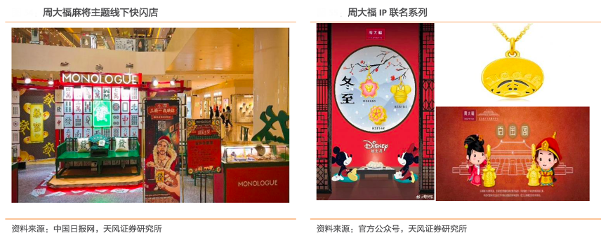 經(jīng)經(jīng)典案例:根據(jù)中國日報網(wǎng)、官方公眾號、天風(fēng)證券研究所等綜合資訊表明,周大福與故宮跨界合作,推出“故宮百寶閣”系 列,以朝珠及手串為靈感來源,選取故宮館藏經(jīng)典文物為原型,延續(xù)故宮的中國風(fēng)高級審美,誕生一大批造型獨特的首飾,廣受好評,時尚界人士佩戴故宮百寶閣首飾,同時與全職高手、冰雪奇緣等受年輕人追捧的 IP 產(chǎn)品也均吸引了大批愛好者。