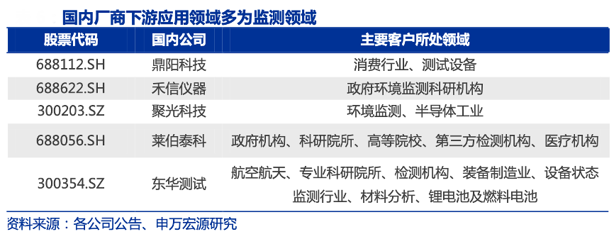 經(jīng)典案例:根據(jù)各公司公告、申萬(wàn)宏源等綜合資訊表明,以五家國(guó)產(chǎn)科研儀器制造商為例,主要大客戶集中于環(huán)境監(jiān)測(cè)領(lǐng)域和工業(yè)應(yīng)用領(lǐng)域,多為政府機(jī)構(gòu)。在此類領(lǐng)域中,客戶國(guó)產(chǎn)化需求較高,大多國(guó)內(nèi)企業(yè)于此發(fā)力。事業(yè)單位客戶類型較為集中,客戶穩(wěn)定性高,國(guó)產(chǎn)科學(xué)儀器制造商具備發(fā)展機(jī)遇。