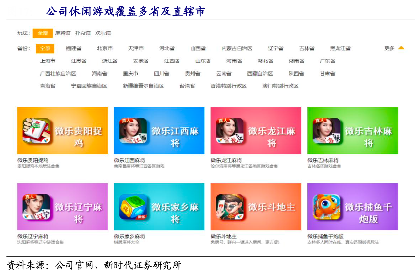經(jīng)典案例:根據(jù)公司官網(wǎng)、新時代證券研究所等綜合資訊表明,家鄉(xiāng)互動公司進軍整個休閑 游戲過程中塑造了微樂,科樂,吉祥三大游戲品牌,根據(jù) 2020 年財報顯示,其目前提供的本地化麻將玩法變種,至少覆蓋中國 28 個 省及直轄市的部分縣城。僅 2020 年內(nèi),其推出了 54 款新麻將玩法變種、18 款新?lián)淇送娣ㄗ兎N 及 2 款休閑游戲,基本實現(xiàn)對主流棋牌游戲玩法的全覆蓋。