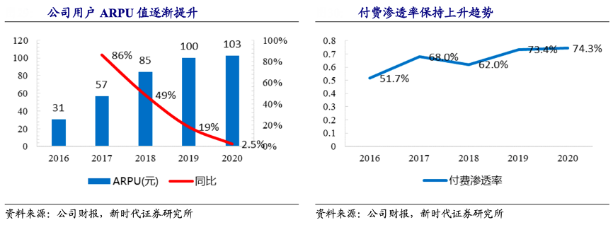 經(jīng)典案例:根據(jù)公司財報、新時代證券研究所等綜合資訊表明,家鄉(xiāng)互動公司 2020 年 ARPU 為 103 元,同比提升 3 元,維持上升趨勢;從付費滲透率方面可以看出,公司用戶的付費滲透率整體保持上升趨勢,從活躍用戶到付費用戶的存量用戶價值挖掘過程穩(wěn)步推進。