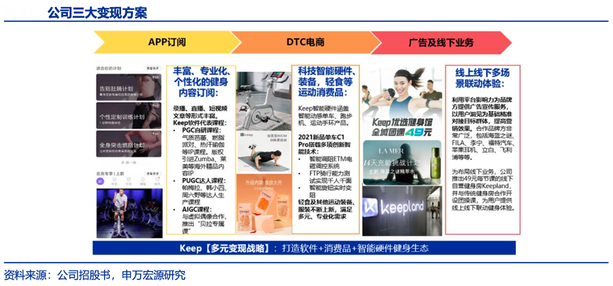 經(jīng)典案例:根據(jù)公司招股書、申萬(wàn)宏源研究等綜合資訊表明,以流量為基礎(chǔ),Keep公司打造軟件+消費(fèi)品+智能硬件的健身生態(tài),降低運(yùn)動(dòng)門檻,提升運(yùn) 動(dòng)體驗(yàn),在全流程運(yùn)動(dòng)方案中促成流量變現(xiàn)。目前其收入來(lái)源主要包括會(huì)員訂閱及線上付費(fèi)內(nèi)容、自有品牌產(chǎn)品、廣告和其他服務(wù)(含線下健身館收入),2021 年前三季度其 收入占比分別為 33%、55%、12%,毛利率分別為 59%、29%、60%。以龐大用戶群為 基礎(chǔ),共生的商業(yè)模式為平臺(tái)帶來(lái)了交叉銷售的機(jī)會(huì)。