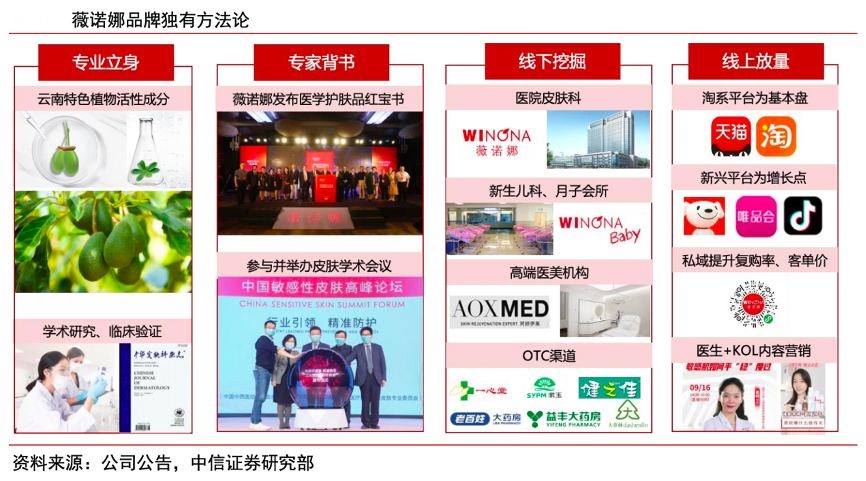 經(jīng)典案例:根據(jù)公司公告、中信證券研究部等綜合資訊表明,貝泰妮公司通過主品牌薇諾娜的發(fā)展探索出了獨有的“貝式”方法論:專業(yè)立身,專家背書,線下挖掘,線上放量。該方法論以高產(chǎn)品力為起點,即產(chǎn)品要真正做到安全、有效;同時 整合皮膚科醫(yī)生、學(xué)術(shù)會議/論壇、醫(yī)院渠道等資源,在線下挖掘出目標(biāo)客群,通過內(nèi)容營銷、全域運營在線上渠道放量、出圈。