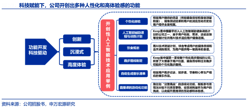 經(jīng)典案例:根據(jù)公司招股書、申萬宏源研究等綜合資訊表明,Keep平臺積累了 用戶的健身信息、互動和交易,可提供關(guān)于用戶偏好和需求以及健身內(nèi)容趨勢的寶貴行業(yè)洞見,并幫助公司開發(fā)人工智能輔助的定制健身內(nèi)容、產(chǎn)品和服務(wù),占領(lǐng)先發(fā)優(yōu)勢。
