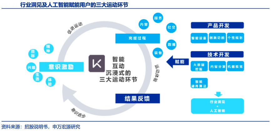 經(jīng)典案例:根據(jù)招股說明書、申萬宏源研究等綜合資訊表明,傳統(tǒng)運(yùn)動品牌主要關(guān)注裝備層面,而 Keep 更善于利用產(chǎn)品開發(fā)及技術(shù)開發(fā),激勵用戶“動起來”。平臺在用戶運(yùn)動過程中提供解決方案,用戶運(yùn)動后將運(yùn)動結(jié)果呈現(xiàn)在 App 上面, 這些結(jié)果會督促用戶加強(qiáng)運(yùn)動、Keep也會根據(jù)運(yùn)動結(jié)果為用戶推薦更適合的運(yùn)動項(xiàng)目。最終相關(guān)數(shù)據(jù)會以 AI 的形式匯集為行業(yè)洞見,輔助平臺做出更多有關(guān)內(nèi)容和功能的開發(fā),完善用戶的三大運(yùn)動環(huán)節(jié)。