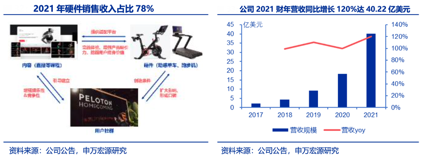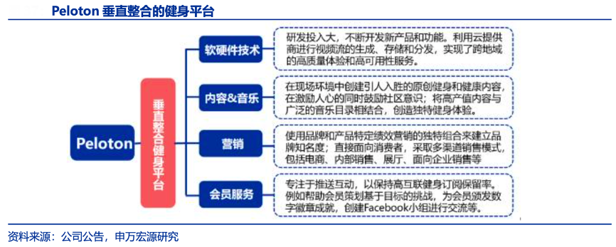 經(jīng)典案例:根據(jù)公司公告、申萬宏源研究等綜合資訊表明,PELOTON是全球最大的互動健身平臺,2012 年成立時,其是主營家庭健身器材的科技硬件制造商,于 2014 年 和 2018 年分別推出健身單車和跑步機,后以智能硬件為切入點,持續(xù)加碼內(nèi)容投入打造線上平臺 Peloton,2019 年 12 月,平臺付費用戶數(shù)達到 71.2 萬,2021 年達到 140 萬,并擁有超過 310 萬活躍用戶的社群。