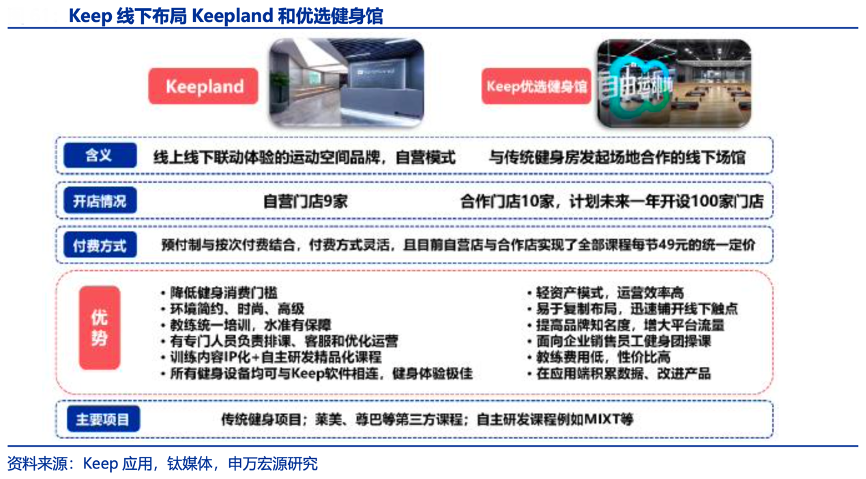 經(jīng)典案例:根據(jù)Keep應(yīng)用、鈦媒體、申萬宏源研究等綜合資訊表明,Keep針對傳統(tǒng)健身房需要一次支付高昂年費(fèi)、用戶黏性差、商家服務(wù)態(tài)度差、教練素質(zhì)參差不齊的痛點(diǎn),Keep在線下布 局 Keepland 和優(yōu)選健身館占領(lǐng)線下健身市場,費(fèi)用均為 49 元/節(jié)。Keepland 作為平臺自營場館具有人性化、專業(yè)化、沉浸式的優(yōu)勢,用戶能夠在線下場館連接 APP 與硬件訓(xùn)練線上課程,Keep 優(yōu)選健身館與傳統(tǒng)健身房基于團(tuán)操課場地的合作一方面提升了健身房團(tuán)課場 地坪效,一方面有利于 Keep 以輕資產(chǎn)模式迅速鋪開線下健身業(yè)務(wù)觸點(diǎn)。