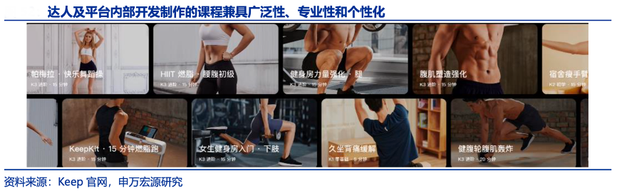 經(jīng)典案例:根據(jù)Keep官網(wǎng)、申萬宏源研究等綜合資訊表明,Keep平臺內(nèi)容在數(shù)量和廣度上均較廣泛,根據(jù)招股書,截至 2021 年 12 月 31 日,平臺內(nèi)部開發(fā)內(nèi)容、達(dá)人開發(fā)內(nèi)容,以及其他內(nèi)容提供者貢獻(xiàn)了約 7,600 節(jié)錄播課。提供的內(nèi)容包括力量訓(xùn)練、有氧運(yùn)動(dòng)、舞 蹈、拳擊、跑步、拉伸、瑜伽、普拉提、冥想和太極。從場景來看,平臺內(nèi)容仍以家庭為 核心,暫未涉及滑雪、潛水等項(xiàng)目。