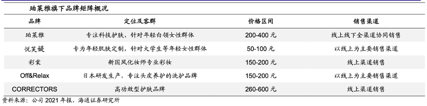 經(jīng)典案例:根據(jù)公司2021年報、海通證券研究所等綜合資訊表明,珀萊雅公司致力于構(gòu)建新國貨化妝品產(chǎn)業(yè)平臺,主要從事化妝品類產(chǎn)品的研發(fā)、生產(chǎn)和銷售。旗下主要擁有“珀萊雅”、“彩棠”、“Off&Relax”、“悅芙媞”、“CORRECTORS”、“優(yōu)資萊”、“韓雅”等品牌。其自有品牌已覆蓋大眾精致護膚、彩妝、洗護、高功效護膚等美妝領(lǐng)域。