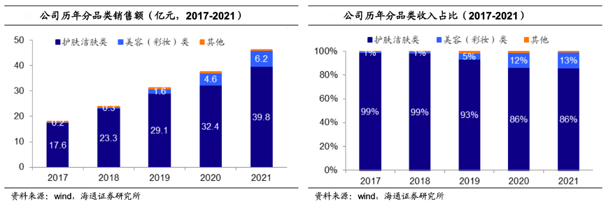經(jīng)典案例:根據(jù)wind、海通證券研究所等綜合資訊表明,珀萊雅成功打造第二品牌彩棠,帶動彩妝品類收入快速增長。從分品類收入結(jié)構(gòu)看,自2019年公司收購彩棠品牌后,美容(彩妝)類產(chǎn)品銷售收入快速增長、占比持續(xù)提高,2019 年、2020 年、2021 年分別為 5%、12%、13%,穩(wěn)步提高。