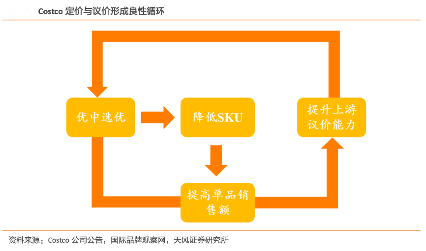 經(jīng)典案例:根據(jù)Costco公司公告、國際品牌觀察網(wǎng)、天風(fēng)證券研究所等綜合資訊表明,Costco低SKU+高質(zhì)量產(chǎn)品,定價(jià)與議價(jià)產(chǎn)生良性循環(huán)。Costco除提供普通 大賣場銷售商品外,還出售各種電子產(chǎn)品、大型家電等長尾品類,但其線下門店的 SKU 數(shù)仍控制在僅 4000 左右,關(guān)鍵就是緊扣會員偏好選品,大包裝模式與批發(fā)購買帶來的低單價(jià)能夠有效刺激會員的購物欲望,從而形成了定價(jià)與議價(jià)的良性循環(huán)。