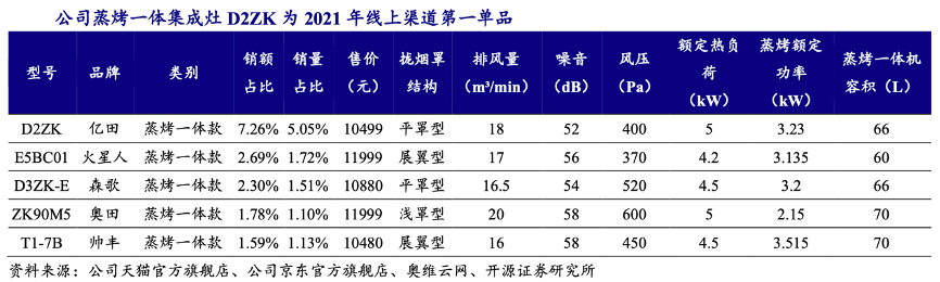 經(jīng)典案例:根據(jù)公司天貓官方旗艦店、公司京東官方旗艦店、奧維云網(wǎng)、開源證券研究所等綜合資訊表明,億田智能D2ZK 煙灶蒸烤一體集成灶產(chǎn)品憑借其大風(fēng)量、低噪音、高熱負(fù)荷、大容積的全面型高產(chǎn)品力,以及高性價(jià)比的價(jià)格,2021年雙 11 大促中單品銷售突破 1 億,成為集成灶品類全網(wǎng)第一單品,根據(jù)億田實(shí)驗(yàn)室數(shù)據(jù),D2ZK的吸凈率達(dá)到99.95%。