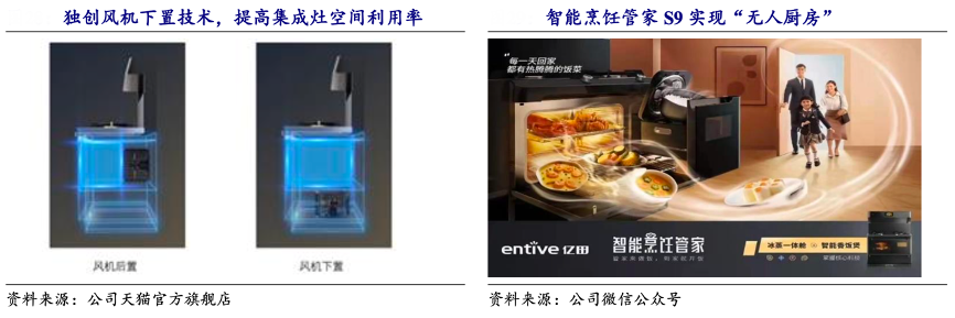 經(jīng)典案例:根據(jù)公司天貓官方旗艦店、公司微信公眾號(hào)、開源證券研究所等綜合資訊表明,2020年,億田公司聯(lián)合阿里天貓發(fā)布行業(yè)首臺(tái)具有成熟語(yǔ)音交互功能的云智能集成灶D5Z,可通過語(yǔ)音交互實(shí)現(xiàn)蒸箱操控、調(diào)溫定時(shí)、風(fēng)量調(diào)節(jié)、控?zé)絷P(guān)停、甚至娛樂功能。2021年,公司推出全球首例“冰蒸一體”智能烹飪管家S9,集成了煙機(jī)、灶具、蒸箱、保鮮柜、煮飯機(jī)器人等多種功能,實(shí)現(xiàn)食材全自動(dòng)清洗與烹飪,打造無(wú)人廚房。