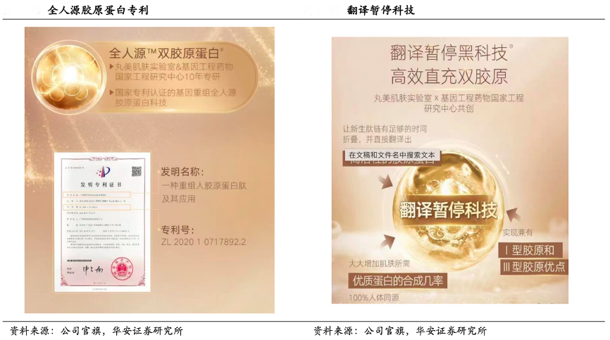 經(jīng)典案例:根據(jù)公司官旗、華安證券研究所等綜合資訊表明,丸美公司堅持“全域布局、縱深覆蓋、生物引領、小步快跑”的科研理念,聚焦皮膚抗衰,深耕美與健康。2021年公司與暨南大學及基因工程藥物國家工程研究中心產(chǎn)學研合作實現(xiàn)重大突破,發(fā)布了與人體自身膠原蛋白的功能結(jié)構域氨基酸序列 100%一致“重組人源化膠原蛋白”。同時利用“翻譯暫停”專利技術對基因序列和蛋白活性進行優(yōu)化,實現(xiàn)了更高效的活性膠原蛋白表達,標志著公司在生物科技抗衰領域進入 2.0 時代。