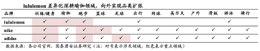 經(jīng)典案例:根據(jù)各公司官網(wǎng)、國泰君安證券研究等綜合資訊表明,在瑜伽運(yùn)動市場尚為藍(lán)海之時,lululemon 差異化定位于瑜伽運(yùn)動,與其余運(yùn)動品牌形成錯位競爭,成功在大牌云集的運(yùn)動行業(yè)立足,并樹立起品牌標(biāo)簽。此后lululemon 也逐步向跑步、網(wǎng)球、健身等領(lǐng)域拓展,盡管其他運(yùn)動品牌也紛紛布局以瑜伽為代表的女子運(yùn)動領(lǐng)域,但 lululemon 憑借先發(fā)優(yōu)勢在瑜伽領(lǐng)域一枝獨秀。