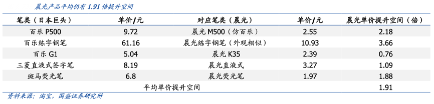 經(jīng)典案例:根據(jù)淘寶、國盛證券研究所等綜合資訊表明,選取日本巨頭和晨光同類型產(chǎn)品比價,晨光產(chǎn)品價格仍有 1.91 倍提升空間。