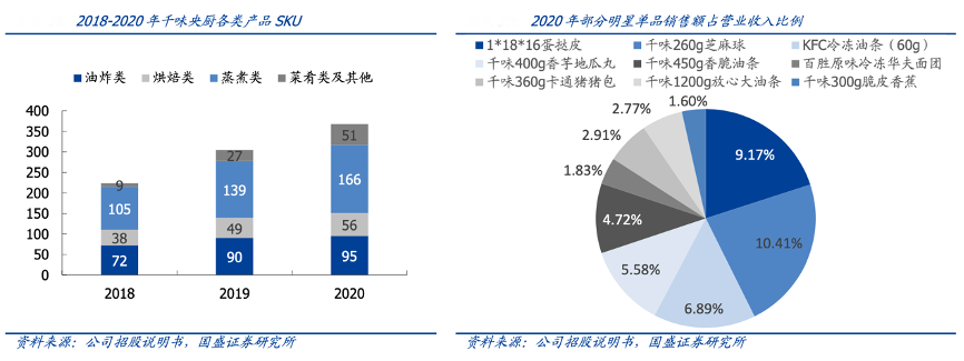 經(jīng)典案例:根據(jù)公司公告、國(guó)盛證券研究所等綜合資訊表明,千味央廚公司產(chǎn)品種類豐富,大單品油條業(yè)績(jī)貢獻(xiàn)穩(wěn)定,中高端定位增厚產(chǎn)品優(yōu)勢(shì),截至 2020 年產(chǎn)品 SKU 已達(dá) 368 種,其中油炸類、烘焙類、蒸煮類、菜肴類的SKU 分別為 95/56/166/51 種。油條作為公司在早期切入餐飲供應(yīng)鏈的核心產(chǎn)品,主打性價(jià)比,已在油條子領(lǐng)域占據(jù)絕對(duì)領(lǐng)先的市場(chǎng)份額,市占率接近 60%。