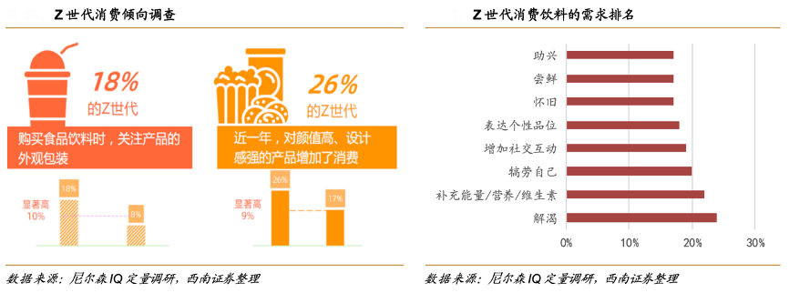 經典案例:根據(jù)尼爾森IQ定量調研、西南證券等綜合資訊表明,Z世代喜歡探索新奇消費,具有高量、高額、高頻次購買食品飲料的特點。在選購食品飲料產品時,Z 世代比非 Z 世代人群更加關注產品的包裝外觀,在包裝顏值高、設計感強的產品上增加消費的比例更高。除了滿足解渴飽腹等基本功能類需求外,Z 世代對飲料零食具有額外的情感類需求,例如增加社交互動和表達個性品位等。因此,具備高顏值的包裝設計和高流 量的 IP 聯(lián)名及冠名宣傳的產品能夠更快速地搶占飲料市場份額,吸引更多 Z 世代實現(xiàn)自我滿足與社交滿足,在激烈競爭中攫取一席之地。