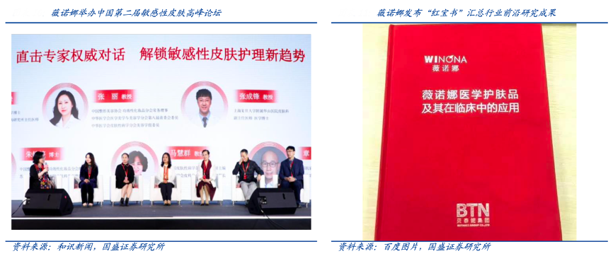 經(jīng)典案例:根據(jù)和訊網(wǎng)、百度圖片、國(guó)盛證券研究所等綜合資訊表明,薇諾娜不斷加深學(xué)術(shù)資源和專(zhuān)業(yè)壁壘,目前擁有約 60 項(xiàng)專(zhuān)利和 11 項(xiàng)核心技術(shù)。2017年薇諾娜聯(lián)合頂尖皮膚科醫(yī)生發(fā)布“紅寶書(shū)”《薇諾娜醫(yī)學(xué)護(hù)膚品 及其在臨床中的應(yīng)用》,收錄國(guó)內(nèi)外核心期刊發(fā)表的 128 篇基礎(chǔ)研究和臨床驗(yàn)證論文,成為行業(yè)技術(shù)引領(lǐng)。同時(shí)2020-2021年,薇諾娜聯(lián)合五大行業(yè)協(xié)會(huì)先后舉辦兩屆敏感性皮膚高峰論壇,聚合產(chǎn)學(xué)研各方力量探討最新研究成果,并聯(lián)合專(zhuān)家共同頒布行業(yè)標(biāo)準(zhǔn)。