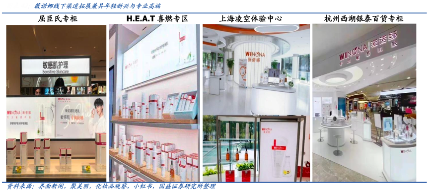 經(jīng)典案例:根據(jù)界面新聞、聚美麗、化妝品觀察、小紅書(shū)、國(guó)盛證券研究所等綜合資訊表明,2020 年 6 月,薇諾娜打破原有傳統(tǒng)渠道,逐步開(kāi)通屈臣氏、H.E.A.T 等新零售渠道,截止 2021 年底已累計(jì)入駐 4000 余家屈臣氏店鋪并收效良好,單店產(chǎn)出逐步提升,2021年 9 月其于上海開(kāi)設(shè)全國(guó)首家線下體驗(yàn)中心,提供產(chǎn)品展示、肌膚檢測(cè)等專(zhuān)業(yè)化的肌膚綜合服務(wù)方案。