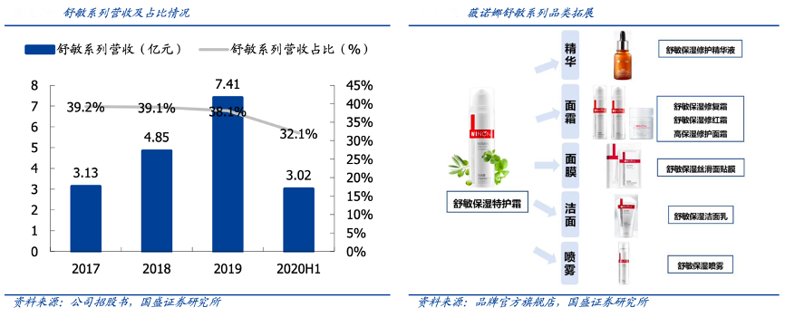 經(jīng)典案例:根據(jù)公司招股書、品牌官方旗艦店、國盛證券研究所等綜合資訊表明,薇諾娜舒敏系列產(chǎn)品除面霜品類外延伸至精華、噴霧等品類,此外,面霜品類內(nèi)也基于特護霜衍生出使用場景更為細(xì)分的產(chǎn)品,如針對非敏感型泛紅肌膚推出“修紅霜”,針對干性敏感肌推出高保濕版本修護霜等。舒敏全系列產(chǎn)品 2017-2020H1 銷售收入分別為 3.13/4.85/7.41/3.02 億元;占比總營收分別為 39.23%/39.09%/38.11%/32.06%,樹立了針對敏感肌產(chǎn)品的行業(yè)標(biāo)桿,“薇諾娜”品牌于 2019 年被行業(yè)權(quán)威雜志《化妝品報》評為“敏 感肌護理品類第 1 名”。