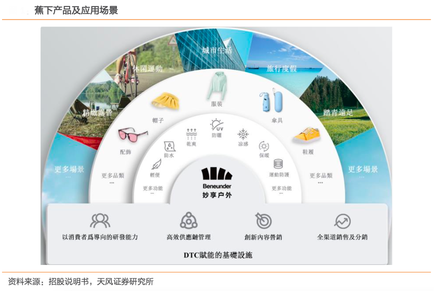 經(jīng)典案例:根據(jù)招股說明書、天風證券研究所等綜合資訊表明,蕉下成立于 2013 年,專為具備休 閑社交屬性的非競技運動及戶外活動場景而設計,包括城市生活、休閑運動、旅行度假、踏青遠足、露營等。其專主要覆蓋服裝、傘具、帽子、其他配飾、鞋履,為消費者提供全面產(chǎn)品。根據(jù)灼識咨詢,以2021年總零售 額及線上零售額計,蕉下均為中國第一大防曬服飾品牌,分別擁有 5.0%及12.9%的市場份額。