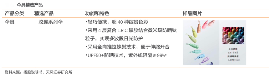 經(jīng)典案例:根據(jù)招股說明書、天風(fēng)證券研究所等綜合資訊表明,2013年蕉下防曬傘推出后受到極大歡迎,至今仍是其旗艦產(chǎn)品之一。傘具產(chǎn)品輕便小巧且具備科技支持的防曬功能,采用 L.R.C 涂層、全向推拉蜂巢技術(shù)及靜音蜂巢技術(shù)等科技,給客戶帶來更好的遮陽、耐用性及流暢使用體驗。同時,其提供三折傘、五折傘和六折傘,以滿足不同客戶需求,其設(shè)計多樣、風(fēng)格各異,包括浮世 繪風(fēng)格和中國古典風(fēng)格。