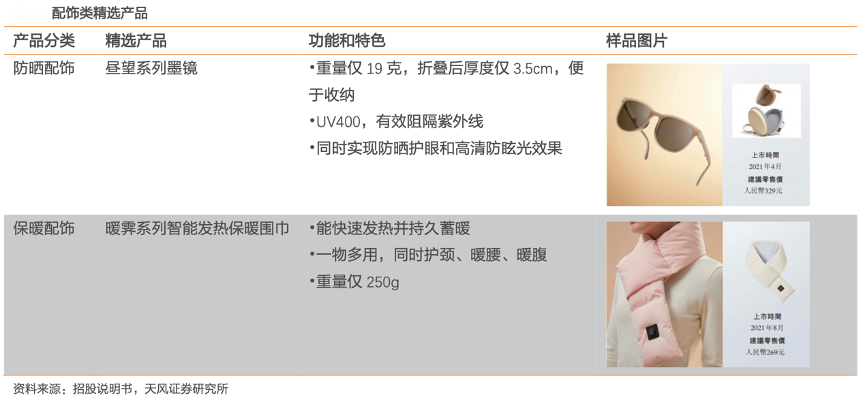 經(jīng)典案例:根據(jù)招股說明書、天風(fēng)證券研究所等綜合資訊表明,蕉下配飾包括保暖系列圍巾、手套和口罩等,溫暖舒適。例如,智能保暖圍巾配備石墨烯加熱墊,通電幾分鐘內(nèi)即迅速升到舒適溫度,還包括多功能肩包、手提包及手提袋,方便戶外攜帶收納。