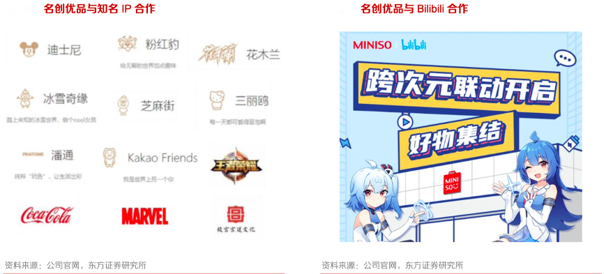 經(jīng)典案例:根據(jù)公司官網(wǎng)、東方證券研究所等綜合資訊表明,名創(chuàng)優(yōu)品公司 11 個大類商品核心 SKU 約為8000+,其中每個門店 SKU 數(shù)約為 3000 個。其采用“711”戰(zhàn)略,即每 7 天為一個商品更新周期,從 1000 件研發(fā)企劃中挑選 100 件商品上新,通過高頻次上新提升消費(fèi)者新鮮感。名創(chuàng)優(yōu)品與迪士尼、漫威、可口可樂等全球知名 IP 授權(quán)方建立合作關(guān)系, FY2020 公司推出了 2300 款核心聯(lián)名企劃商品,緊貼年輕消費(fèi)群體的消費(fèi)潮流,幫助公司進(jìn)一步擴(kuò)大品牌知名度。
