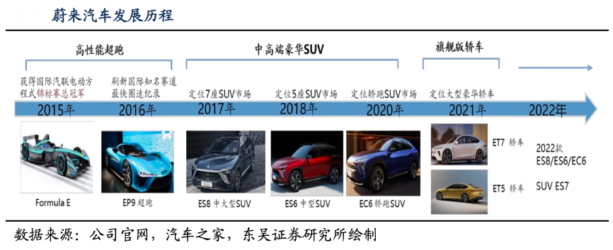 經(jīng)典案例:根據(jù)公司官網(wǎng)、汽車之家、東吳證券研究所等綜合資訊表明,蔚來于 2014 年 11 月由李斌等聯(lián)合創(chuàng)立,主要業(yè)務(wù)包括研發(fā)、制造與銷售電動車,推動自動駕駛和人工智能的創(chuàng)新,提供全面、便捷的充電解決方案等。蔚來于 2015-2016 年以高性能超跑高調(diào)進軍電動車行業(yè),2017- 2018 年發(fā)布兩款豪華 SUV ES8 和 ES6。2018 年 9 月蔚來在紐交所上市,2020 年發(fā)布轎 跑 SUV EC6。2021 年 1 月蔚來發(fā)布首款轎車 ET7 并開始預(yù)售,2022 年 3 月底開啟交付。