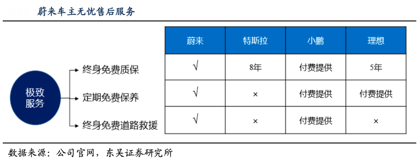 經(jīng)典案例:根據(jù)公司官網(wǎng)、東吳證券研究所等綜合資訊表明,蔚來首任車主自動享有終身免費質(zhì)保、終身免費道路救援和終身免費車聯(lián)網(wǎng)服務(wù),其還推出了 Service package 用戶無憂服務(wù)包,涵蓋保險、維修、保養(yǎng)三大板塊。