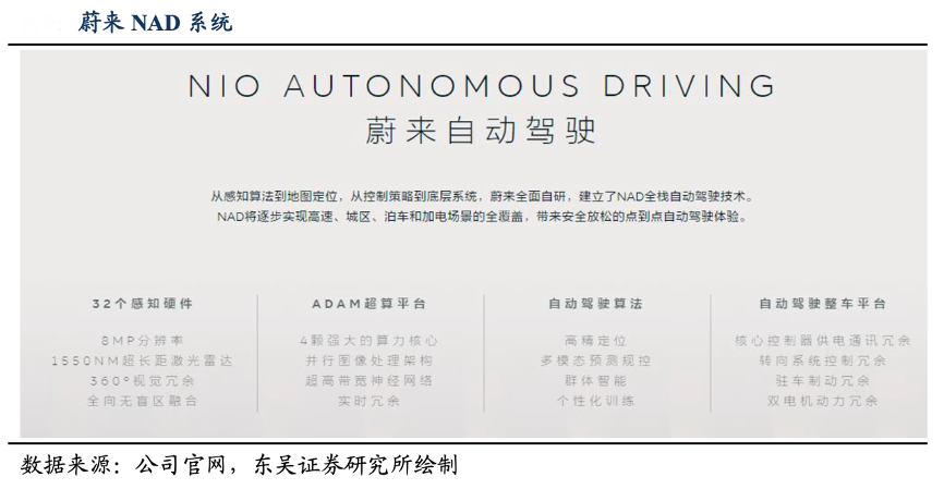經(jīng)典案例:根據(jù)公司官網(wǎng)、東吳證券研究所等綜合資訊表明,2021年蔚來在原有 Pilot 系統(tǒng)上升級發(fā)布 NAD 系統(tǒng),建立了包含感知算法、地圖定位、決策控制和底層系統(tǒng)在內(nèi)的全棧自動駕駛技術(shù)能力,NAD基于 NIO Aquila 超感系統(tǒng)以及 NIO ADAM 超算平臺設(shè)計,整套系統(tǒng)可以逐步實現(xiàn)在高速、城區(qū)、泊車、加電等場景下的點到點自動駕駛,基本完成所有 L3 級別自動駕駛行車功能。