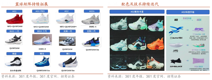 經(jīng)典案例:根據(jù)361度年報(bào)、361度官網(wǎng)、招商證券等綜合資訊表明,361度籃球領(lǐng)域推出球星簽名戰(zhàn)靴提升影響力。其將 NFO、QU!KFOAM 等核心中底科技應(yīng)用至籃球鞋提升性能,同時(shí)簽約可蘭白克、阿隆戈登、丁威迪等籃球明星提升品牌影響力,推出可蘭白克簽名戰(zhàn)靴克制系列、戈登簽名戰(zhàn)靴 AG 系列。