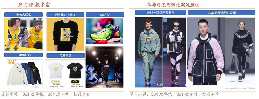 經(jīng)典案例:根據(jù)361度年報(bào)、361度官網(wǎng)、招商證券等綜合資訊表明,361度在休閑潮流領(lǐng)域持續(xù)增加熱門(mén) IP 款推出,與動(dòng)漫、游戲、國(guó)潮 IP 多次合作, 推出小黃人、刺客伍六七、穿越火線、三星堆等多款聯(lián)名產(chǎn)品,并通過(guò)公司成熟的核心科技提升產(chǎn)品性能,2021 年其以三體聯(lián)名為契機(jī)參加中國(guó)國(guó)際時(shí)裝周與深圳時(shí)裝周,強(qiáng)化品牌潮流屬性,簽約龔俊及王安宇拓展年輕客群。