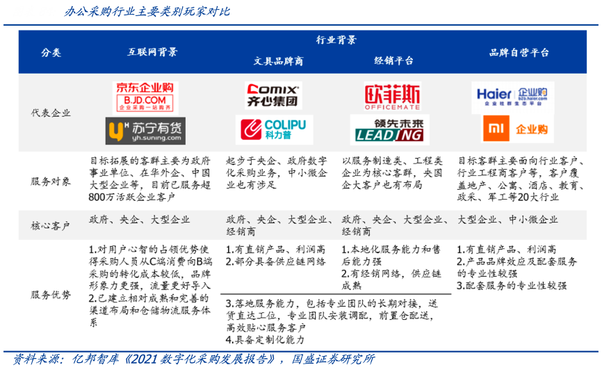 經(jīng)典案例:根據(jù)億邦智庫《2021數(shù)字化采購發(fā)展報(bào)告》、國盛證券研究所等綜合資訊表明,辦公采購行業(yè)呈現(xiàn)兩大趨勢(shì):1)采購平臺(tái)加速數(shù)字化轉(zhuǎn)型,向“硬件+軟件+服務(wù)”融合發(fā)展模式變革,京東、齊心集團(tuán)、科力普等處于龍頭地位,專業(yè)技術(shù)平臺(tái)如 Coupa 等加入競(jìng)爭(zhēng);2)品類、客群形成交叉,辦公采購電商拓展 MRO 品類,MRO垂直平臺(tái)布局辦公市場(chǎng),市場(chǎng)競(jìng)爭(zhēng)加劇。
