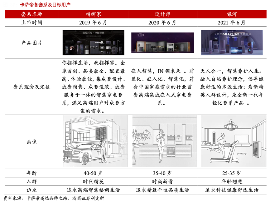 經(jīng)典案例:根據(jù)卡薩帝高端品牌之路、浙商證券研究所等綜合資訊表明,薩帝在 2019 年、2020 年和 2021 年上新了指揮家、設計師和銀河套系產(chǎn)品,其用戶畫像從時代精英到時尚新貴,再到年輕翹楚,年齡呈下降趨勢。這符合80后、90后逐漸成為高端消費主力的趨勢。同時卡薩帝在三年內接連推出成套化產(chǎn)品,用戶年齡橫跨25-50歲,在消費人群全覆蓋的基礎上,也進一步激發(fā)了年輕化市場的高端需求。