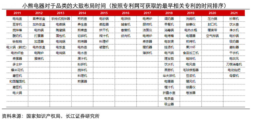 經(jīng)典案例:根據(jù)國家知識產(chǎn)權(quán)局、長江證券研究所等綜合資訊表明,從品類最早涉及的相關(guān)專利時(shí)間來看,小熊公司大部分品類的研發(fā)時(shí)間較早,提前針對性地做好產(chǎn)品儲備;如 2011 年涉及到的加熱杯 墊在近年來消費(fèi)熱點(diǎn)逐步出現(xiàn),如 2012 年涉及到的加熱飯盒在 2020 年受益于疫情快 速爆發(fā),如 2019 年公司研發(fā)了按摩儀的對應(yīng)產(chǎn)品,而 2020 年以來按摩儀系列產(chǎn)品的 行業(yè)消費(fèi)景氣度持續(xù)較優(yōu)??梢娖鋵τ谛〖译姷漠a(chǎn)品品類覆蓋面較廣,且大部分品類的相關(guān)儲備做得較早,走在市場需求之前。