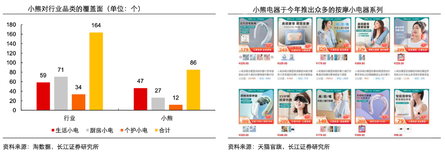 經(jīng)典案例:根據(jù)淘數(shù)據(jù)、天貓官旗、長江證券研究所等綜合資訊表明,小熊電器目前覆蓋的廚房、生活、個(gè)護(hù)的小電品類數(shù)量分別為 27、47、12 個(gè),合計(jì)達(dá)到 86 個(gè),可見品類擴(kuò)張仍有空間。2021年以來,小熊在進(jìn)一步發(fā)力進(jìn)軍母嬰市場的基礎(chǔ)上,擴(kuò)張了其他子行業(yè)的產(chǎn)品線,譬如其加大了對按摩小電器產(chǎn)品的覆蓋,產(chǎn)品價(jià)格上依舊遵循此前的性價(jià)比、親民定位。