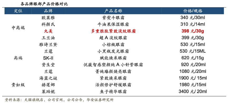 經(jīng)典案例:根據(jù)天貓旗艦店、公司官網(wǎng)、公司公告、華安證券研究所等綜合資訊表明,對(duì)標(biāo)國(guó)際高端品牌眼部產(chǎn)品,“丸美”具有一定價(jià)格優(yōu)勢(shì):對(duì)標(biāo)國(guó)內(nèi),同類(lèi)型競(jìng)爭(zhēng)對(duì)手少,丸美是少有的國(guó)產(chǎn)中高端定位并具一定規(guī)模的品牌。與國(guó)際品牌對(duì)比,公司產(chǎn)品屬于中高端,在眼霜中具有性?xún)r(jià)比。