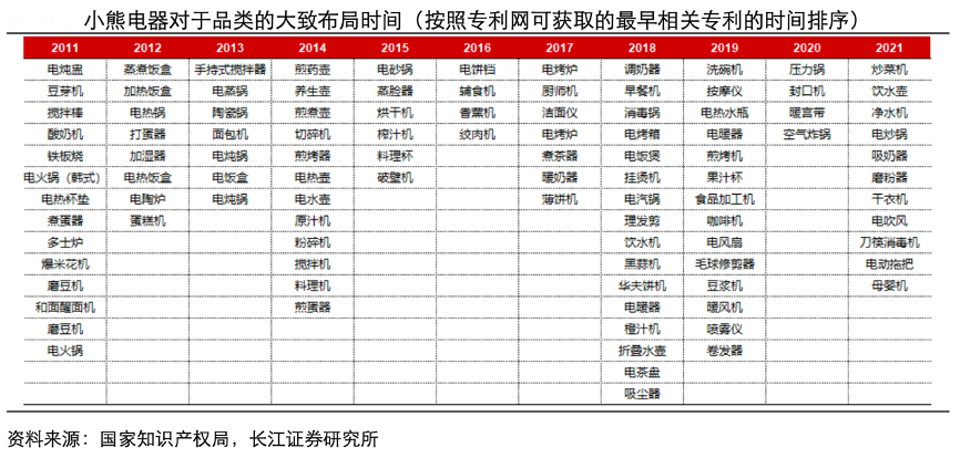 經(jīng)典案例:根據(jù)國(guó)家知識(shí)產(chǎn)權(quán)局、長(zhǎng)江證券研究所等綜合資訊表明,從品類最早涉及的相關(guān)專利時(shí)間來(lái)看,小熊電器公司大部分品類的研發(fā)時(shí)間較早,提前針對(duì)性地做好產(chǎn)品儲(chǔ)備;如 2011 年涉及到的加熱杯 墊在近年來(lái)消費(fèi)熱點(diǎn)逐步出現(xiàn),如 2012 年涉及到的加熱飯盒在 2020 年受益于疫情快 速爆發(fā),如 2019 年公司研發(fā)了按摩儀的對(duì)應(yīng)產(chǎn)品,而 2020 年以來(lái)按摩儀系列產(chǎn)品的行業(yè)消費(fèi)景氣度持續(xù)較優(yōu)。可見公司對(duì)于小家電的產(chǎn)品品類覆蓋面較廣,且大部分品類的相關(guān)儲(chǔ)備做得較早,走在市場(chǎng)需求之前。