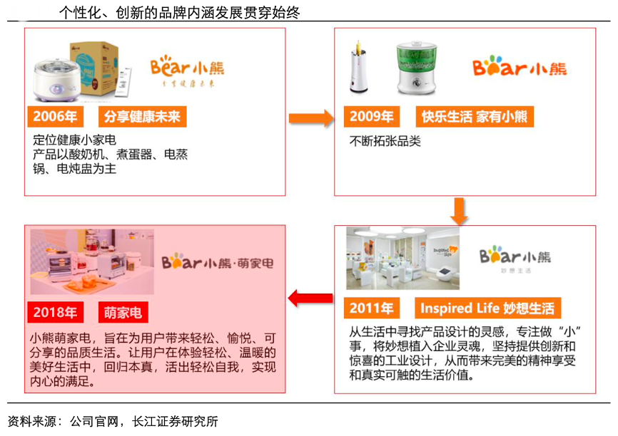 經(jīng)典案例:根據(jù)公司官網(wǎng)、長(zhǎng)江證券研究所等綜合資訊表明,早在 2006 年,小熊公司在廣州佛山成立的初始 階段,其已開發(fā)了酸奶機(jī)、煮蛋器、電蒸鍋、電燉盅等當(dāng)前仍在熱銷的小家電細(xì)分品類。此后,公司品牌內(nèi)涵不斷迭代和演化,“健康未來(lái)”—“快樂(lè)生活”—“妙想生活” —“萌家電”,無(wú)一不是從區(qū)別于美九蘇的差異化定位出發(fā)。
