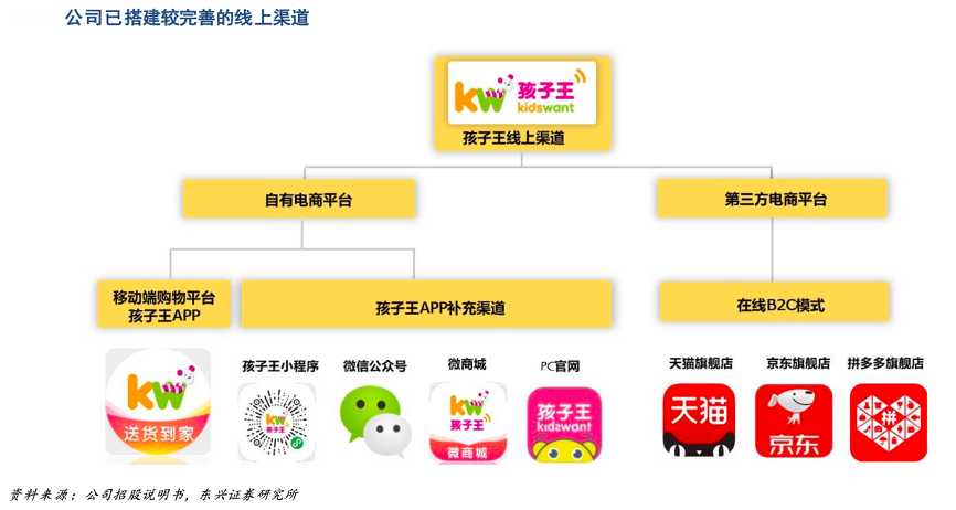 經(jīng)典案例:根據(jù)公司招股說(shuō)明書、東興證券研究所等綜合資訊表明,面對(duì)近年來(lái)零售渠道的線上化轉(zhuǎn)型,孩子王已搭建較為完善的線上銷 售體系。其主要通過(guò)移動(dòng)端購(gòu)物平臺(tái)(孩子王 APP)、微信平臺(tái)(孩子王公眾號(hào)、小程序、微商城)、 PC 端購(gòu)物平臺(tái)(孩子王網(wǎng)上商城)等網(wǎng)絡(luò)平臺(tái)開展線上業(yè)務(wù),還通過(guò)第三方電商平臺(tái)“天貓商城”、“京東”、“拼多多”開設(shè)“孩子王官方旗艦店”。 2019 年公司的孩子王 APP 在 Trustdata 母嬰電商類 APP 的排名第一。