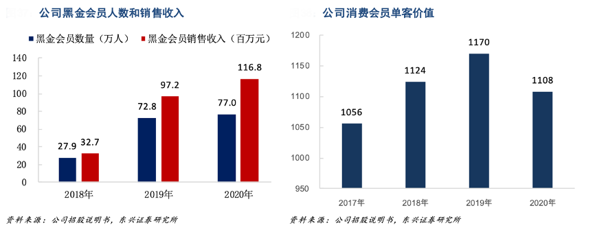 經(jīng)典案例:根據(jù)公司招股說(shuō)明書、東興證券研究所等綜合資訊表明,為進(jìn)一步提高單客產(chǎn)值,黑子王公司對(duì)會(huì)員進(jìn)行了更加精細(xì)化的運(yùn)營(yíng)。其公司 2018 年 5 月推出付費(fèi)黑金 PLUS 會(huì)員,分別針對(duì)孕婦和嬰幼童兩大目標(biāo)用戶推出了孕享卡(399 元/年) 和成長(zhǎng)卡(199 元/年),有效期均為 1 年,截至 2020 年末公司累計(jì)黑金會(huì)員 規(guī)模超過(guò) 70 萬(wàn)人,會(huì)員數(shù)量和銷售收入逐年增加,2018 年-2020 年黑金會(huì)員單個(gè)會(huì)員平均收入分別為 117.36 元/133.53 元/151.71 元,2020 年付費(fèi)會(huì)員單客年產(chǎn)值為普通會(huì)員的 10 倍。