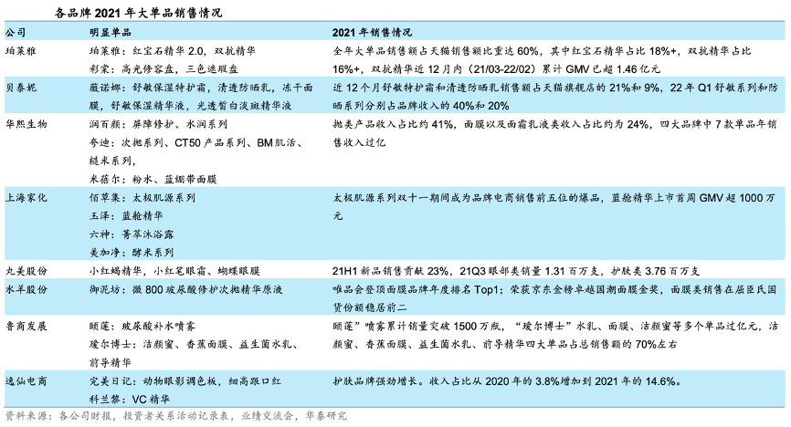 經(jīng)典案例:根據(jù)各公司財(cái)報(bào)、投資者關(guān)系活動(dòng)記錄表、業(yè)績交流會(huì)、華泰研究等綜合資訊表明,2021 年,珀萊雅、貝泰妮(薇諾娜)、華熙生物(潤百顏/夸迪等)等國貨龍頭繼續(xù)發(fā)力產(chǎn)品,明星單品的亮眼表現(xiàn)成為其收入增長根本引擎。