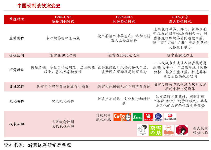 經(jīng)典案例:根據(jù)浙商證券研究所等綜合資訊表明,新式茶飲的原料追求多樣化、高標(biāo)準(zhǔn),打造“茶、奶、果”的完美融合,單杯價格普遍在 20 元以上,門店主要布局在大型商場一樓的核心點(diǎn)位,對商場起到引流作用。這一階段的茶飲注重品牌文化建設(shè),消費(fèi)場景升級,社交屬性顯現(xiàn),新入局的典型玩家包括喜茶、奈雪的茶等,引領(lǐng)行業(yè)新發(fā)展。