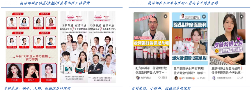 經(jīng)典案例:根據(jù)快手、天貓、小紅書、國盛證券研究所等綜合資訊表明,薇諾娜公司通過主播達(dá)人、明星開屏等強(qiáng)互動(dòng)的內(nèi)容化營銷,形成社交裂變不斷破圈觸達(dá)新消費(fèi)者。如抖音與“帶貨一姐”朱瓜瓜合作打響知名度,品牌號精細(xì)化經(jīng)營有效承接流量;快手超品日邀請專業(yè)主播從醫(yī)研角度剖析產(chǎn)品并給予護(hù)理指 導(dǎo);小紅書平臺與醫(yī)護(hù)人員、配方師及專業(yè)護(hù)膚達(dá)人合作;微博平臺定期邀請皮膚科專 家免費(fèi)直播義診并逐步拓展至其他平臺。通過在社媒平臺建立高價(jià)值、高轉(zhuǎn)化的長效品牌陣地,薇諾娜在2021 年雙十一期間收獲抖音美妝自播第 1,快手第 6 的亮眼排名。